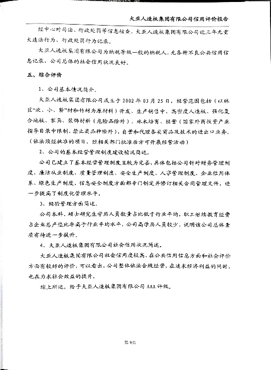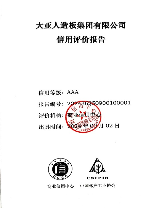 中國林產(chǎn)工業(yè)協(xié)會委托商業(yè)信用中心,對大亞人造板集團有限公司的信用狀況,按照《中國林產(chǎn)工業(yè)行業(yè)信用評價指標體系》做出“中國林產(chǎn)工業(yè)行業(yè)信用AAA級”的評定, 并將信用評價結(jié)果在中國林產(chǎn)工業(yè)協(xié)會官方網(wǎng)站、商業(yè)信用中心官網(wǎng)、國有企業(yè)采購供應(yīng)信用管理平臺、公共資源交易主體信用服務(wù)平臺、行業(yè)信用信息服務(wù)等平臺上予以公示和發(fā)布。